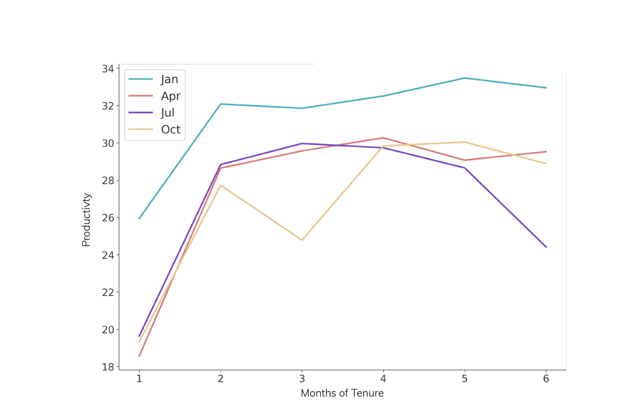 Caption: Figure 1: This graph shows the productivity of developers during their first six months of employment. Productivity is defined as the total amount of coding effort divided by the total number of developers. Each colour represents a different month that the developer joined.