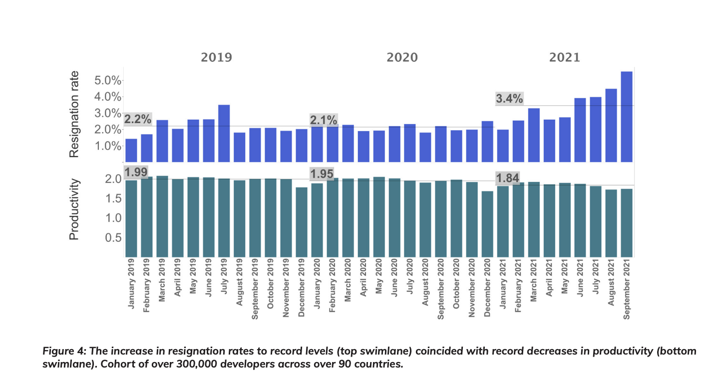 Caption: The increase in resignation rates to record levels coincided with record decreases in productivity. Cohort of over 300,000 developers across over 90 countries.